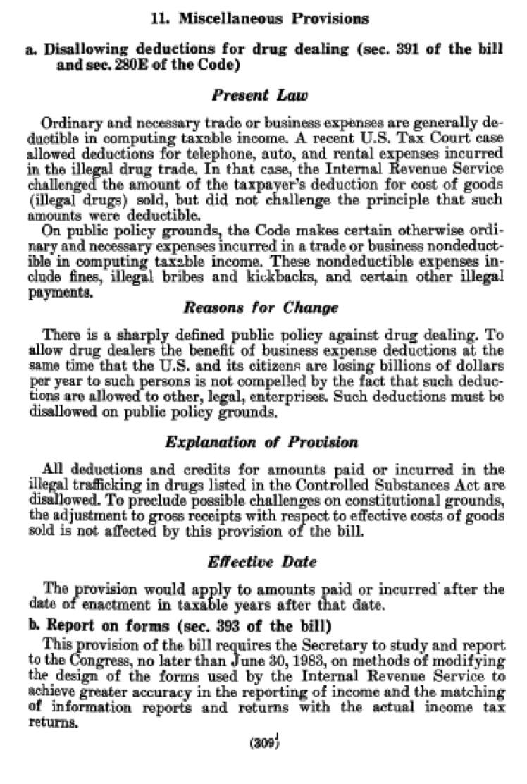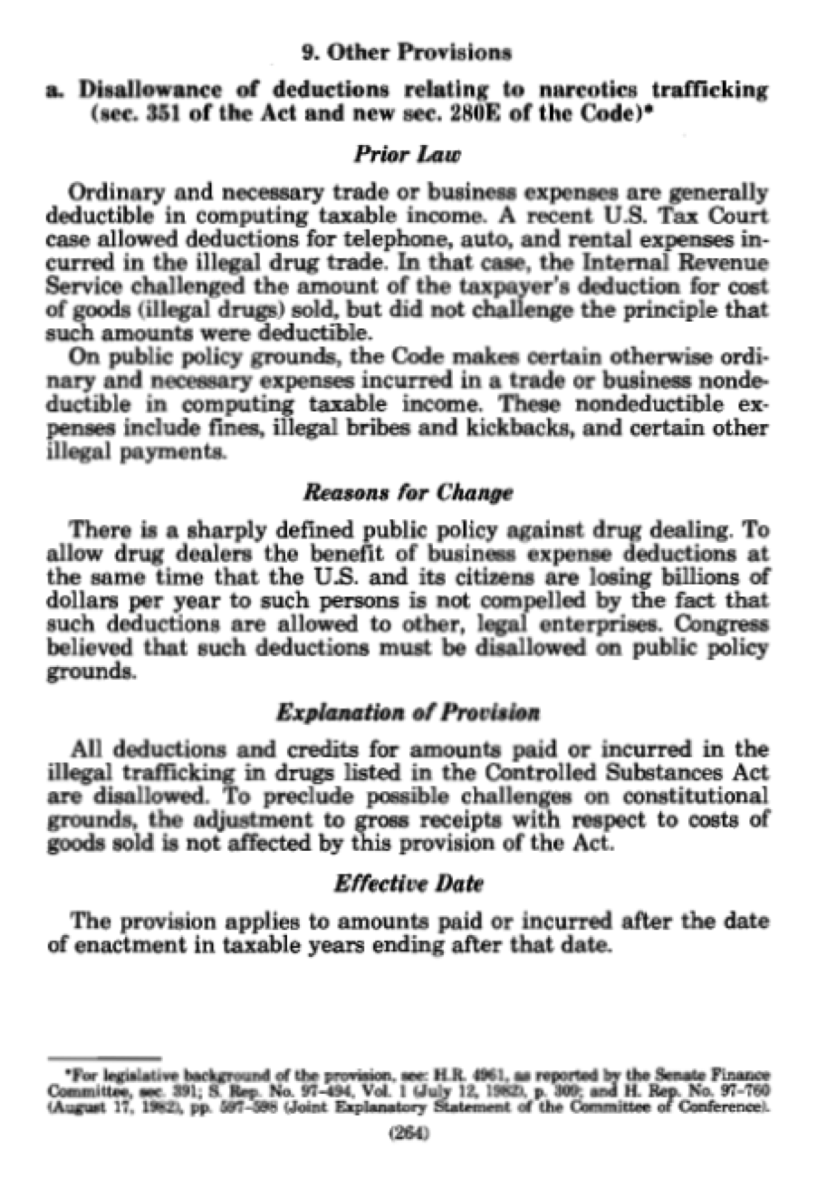 Marijuana Tax: Section 280E — Text, Senate Finance, and Joint Committee legislative history