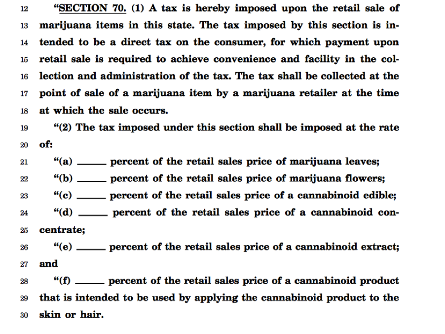 The proposed sales tax was one of the major provisions included in a new 104-page amendment aimed at implementing the marijuana legalization initiative approved last November by voters.