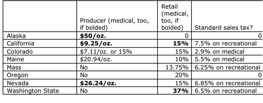 Oregon’s 20-percent number reflects a 17-percent state tax and universally adopted 3-percent local taxes. Otherwise local taxes are more of a patchwork, and are ignored. Colorado and Nevada have nominal 15-percent producer taxes. Colorado converts its tax to a weight base for related party or vertically integrated cases. https://newrevenue.org/2017/07/23/is-colorados-new-marijuana-tax-leaky/. Nevada converts to a weight base for all cases. https://newrevenue.org/2017/07/02/nevadas-70-cent-per-gram-tax-on-marijuana-flower/