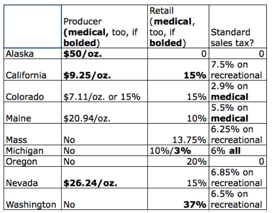 Now the sophisticated weight-based schemes in place in Alaska, California, Colorado, Maine, and Nevada, all tax multiple categories of product. Potent bud is typically taxed at about three times the rate per ounce used for less potent bud. California’s tax for flower is $9.25 per ounce; for leaves or trim, it’s $2.75.