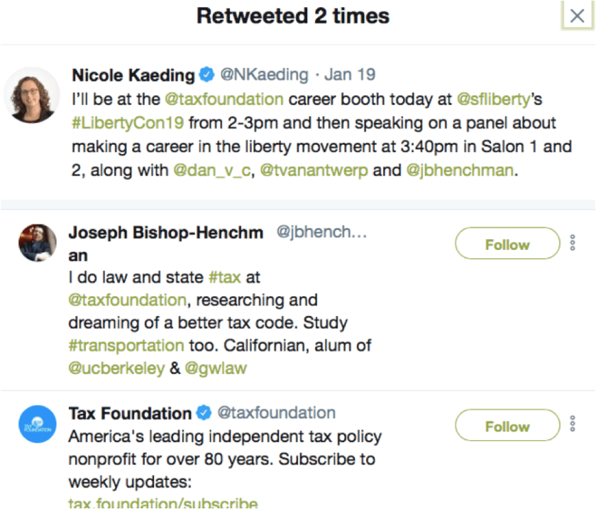 The tweet below, indicating that working for the Tax Foundation is “a career in the liberty movement,” was retweeted by the Tax Foundation – an imprimatur.