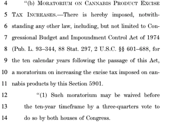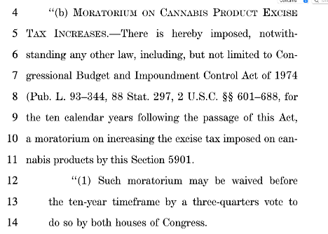 To prove how anti-tax she is, the bill adds a “Moratorium” – no increase in that tiny tax for 10 years, unless three-quarters of each House agrees to an increase. Now that moratorium can be rescinded by a simple majority Act of Congress at any time: One Congress cannot bind another. Still the filibuster (requiring 60 Senate votes) could be repealed by a simple majority Act of Congress at any time, but that time has not come. I know of no current rule tying Congress’s hands on taxes.