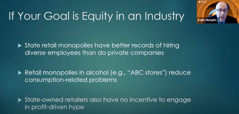 In general retail monopolies (that’s where the industry still produces the product; the state sells it) have a better record of hiring diverse employees than do private companies. I mean that’s one of the striking things I’ve noticed. I live out here [in California] next to a lot of venture capital firms that finance this industry. They talk a lot about racial equity but it’s remarkable how almost uniformly white the people who run that industry are. But state retail monopolies do better than that and that might be a way to promote more equitable employment