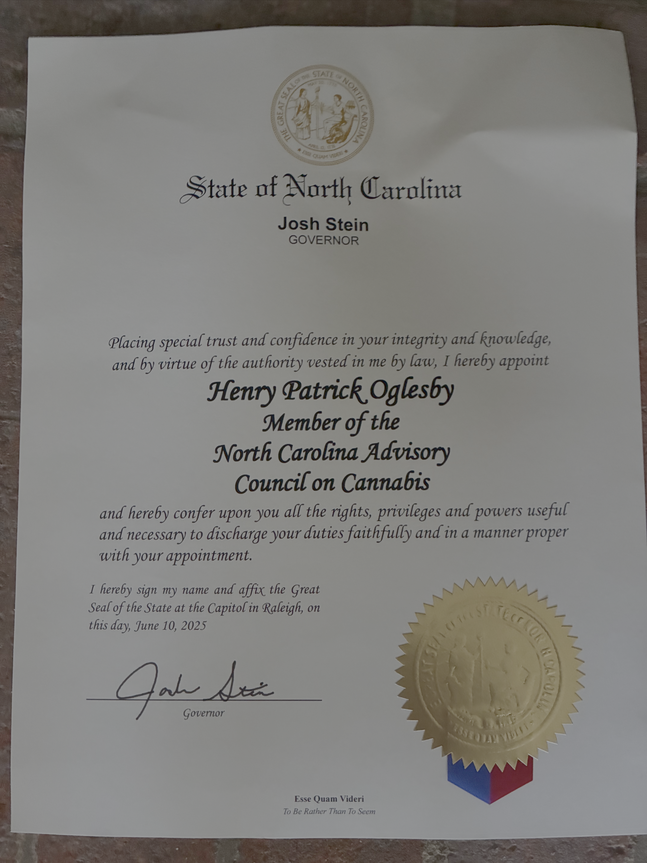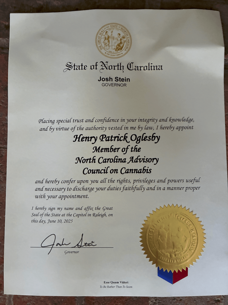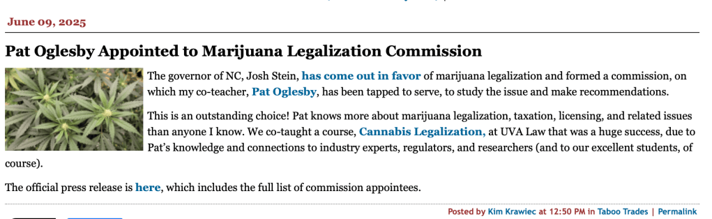 “The governor of NC, Josh Stein, has come out in favor of marijuana legalization and formed a commission, on which my co-teacher, Pat Oglesby, has been tapped to serve, to study the issue and make recommendations.